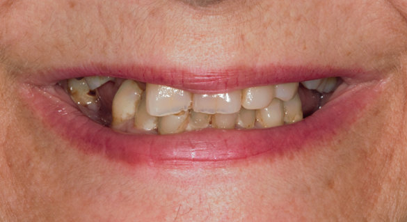 Εικόνα. Η ασθενής παρουσιάζει πολλαπλές ελλείψεις δοντιών στην άνω και κάτω γνάθο. Αναφέρει δυσκολία στη μάσηση και στην ομιλία.