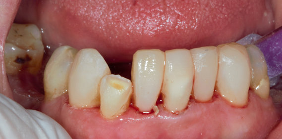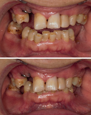 Εικόνα. Παρατηρείται επίσης έλλειψη προσθετικού χώρου. Με την πάροδο του χρόνου η αποτριβή των δοντιών που έχουν απομείνει είναι εκτεταμένη(κυρίως των κάτω προσθίων). Επίσης λόγω των πολλαπλών εξαγωγών τα δόντια έχουν μετακινηθεί στα κενά με αποτέλεσμα ο χώρος για τα ‘καινούρια’ δόντια να είναι ελάχιστος.