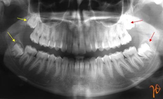 Εικόνα 1. Πανοραμική ακτινογραφία: Με κίτρινα βέλη σημειώνονται οι δεξιοί άνω και κάτω φρονιμίτες και με κόκκινα βέλη οι αριστεροί.