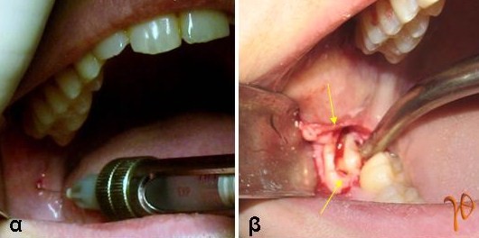 Εικόνα 3. Μετά την τοπική αναισθησία (α), γίνεται μικρή τομή στα ούλα και αποκαλύπτεται χειρουργικά το έγκλειστο δόντι (βέλη) (β).
