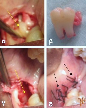 Εικόνα 4. Ο φρονιμίτης αφαιρείται(βέλος) (α και β), και η θέση του οστικού ελλείμματος – το οποίο σταδιακά θα αναπληρωθεί με νέο κόκκαλο – συρράπτεται(βέλη) (γ και δ).