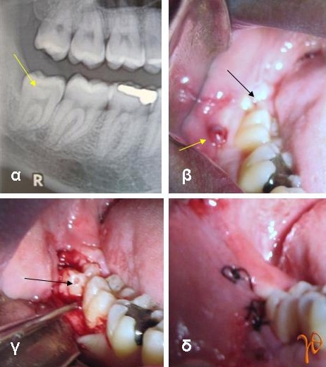 Εικόνα 5. (α): Λεπτομέρεια της πανοραμικής ακτινογραφίας στην οποία σημειώνεται με βέλος ο έγκλειστος φρονιμίτης. (β): Με μαύρο βέλος η θέση των ούλων που αντιστοιχεί στον έγκλειστο φρονιμίτη και με κίτρινο βέλος η βλάβη (συρρίγγιο) που αυτός έχει προκαλέσει. (γ και δ): Ο φρονιμίτης αποκαλύπτεται και αφαιρείται (βέλος) και το τραύμα συρράπτεται.